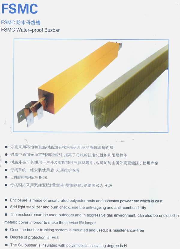 FSMC防水性母線槽外殼采用不飽和聚脂樹脂加石棉粉等無機材料整體澆鑄而成;樹脂中添加光穩定劑和阻燃劑,提高了母線的抗老化性能和阻燃性能;樹脂外殼可長期用于戶外及有腐蝕性氣體環境中,也可加制金屬外殼更能延長使用壽命;母線系統一經安裝使用后,無須維護保養;母線防護等級為|P68;母線銅排采用聚烯亞胺(黃金帶)增加絕緣,絕緣等級為H級。